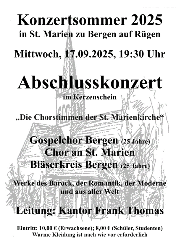 Im Rahmen des Konzertsommer 2013 und der 400 Jahrfeier der Stadt Bergen auf Rügen kam es am 28. Augsut 2013 zu einem imposanten OpenAir Konzert im Klosterhof hinter der Kirche.