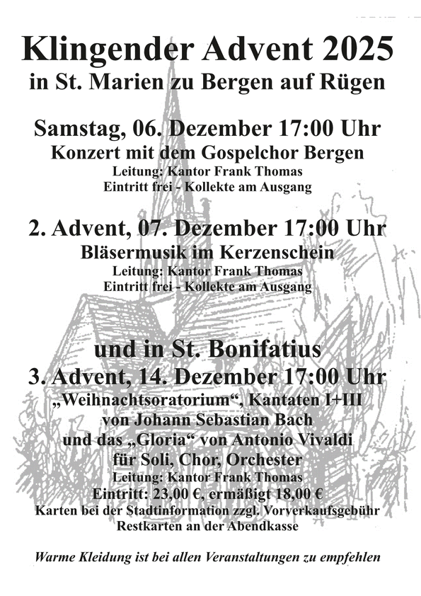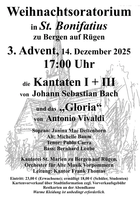 Mit Unterstützung der Solisten Sarah Mengs (Sopran), Ruth Geigle (Alt), Damien Smedje (Tenor) und Jürgen G. Groth (Bass) sowie dem Bläserensemble Alexander Pfeifer, dem Organisten Frank Zimpel und Absolventen und Studierende der HMT Rostock und dem Chor von St. Marien Bergen konnte am 16. Dezember 2012 erstmals auf Rügen das Weihnachtsoratorium aufgeführt werden.